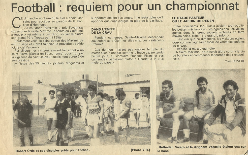 début mai 1984 : Victoire sur le terrain de Le Luc 1 à 0 pour le dernier match de la saison, qui permet de terminer 1er de la poule et d'accéder à la DHR