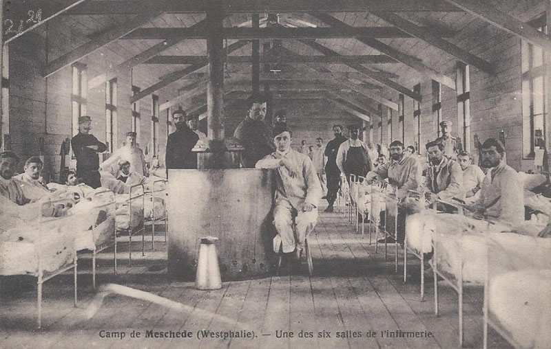 Camp de prisonniers, situé à l'est de Düsseldorf, sur la Ruhr. Meschede est une ville de 4 000 habitants entourée de forêts de sapins, bâtie au confluent de la Henne et de la Ruhr. Le camp, rectangulaire, entouré de plusieurs rangs de fils de fer barbelés, très serrés et très hauts, est situé sur une colline qui domine la ville. Il est composé lors de sa construction en décembre 1914, de 2 baraquements en planches, pouvant loger 100 prisonniers chacun, et de plusieurs bâtiments servant aux magasins et cuisines, à un lazaret, logement du gardien, des soldats et officiers qui gardent le camp. A l'ouverture du camp, la nourriture y est infecte et insuffisante, l'hygiène inconnue (1 litre d'eau par personne pour 3 jours !), les latrines : 1 tranchée d'1 mètre de profondeur et de large, barrée d'une planche. Les prisonniers travaillent en kommando à l'extraction de la pierre, au travail du bois, dans des fermes. De nombreux prisonniers entre 1914 et mars 1915, furent enterrés dans le cimetière de la ville. Début 1915, le camp change d'aspect, création d'une route princale, avec allées transversales et trottoirs en ciment, apparition de robinets, bornes-fontaines, salles de douches, autoclaves pour le linge, vastes et propres "water", nouveaux baraquements, espacés et alignés, 1 lazaret composé de 6 grandes baraques, au centre duquel se trouve une chapelle ; nouvelle palissade, de 4 mètres de haut, formant chemin de ronde, une autre clôture de barbelés de 3 mètres de haut, les sentinelles, aux 4 coins du camp, sont installées dans des observatoires hauts de 8 mètres ; sur les hauteurs, tout autour du camp, des mitrailleuses et des 71 de campagne, et de puissantes lampes électriques. |